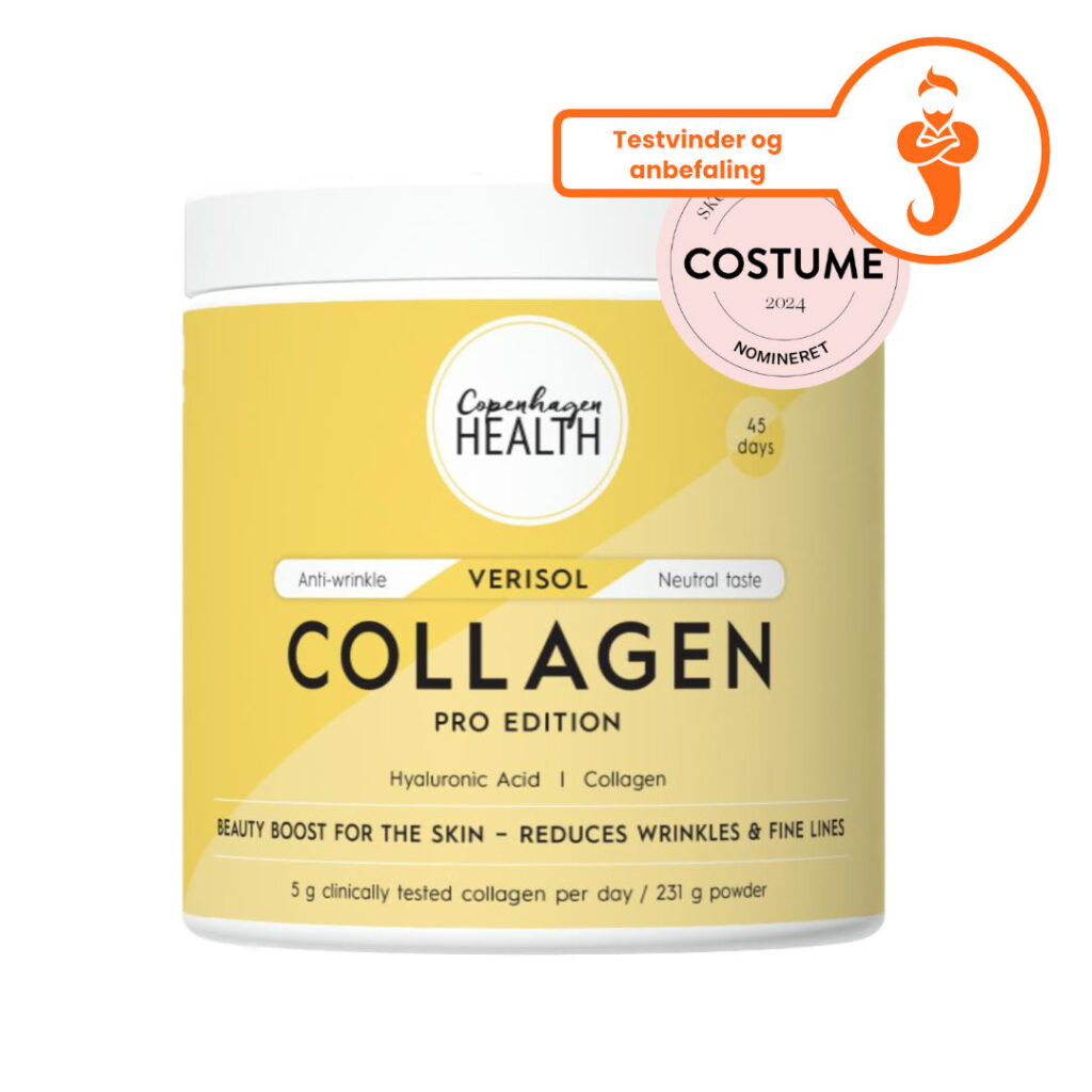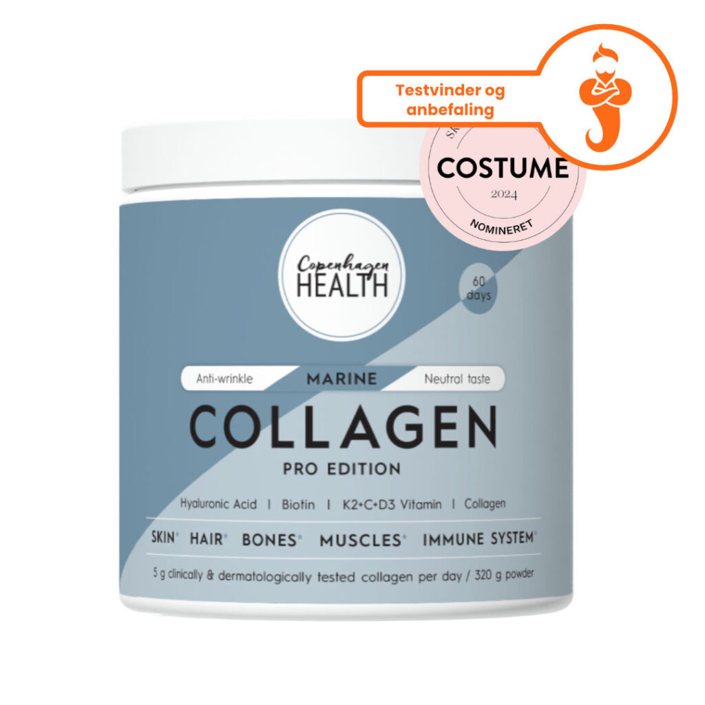 Copenhagen Healths Marine Collagen Pro Edition består af 100 % hydrolyserede marinekollagenpeptider (beauty) produceret i EU og er tilsat en stor dosis hyaluronsyre og flere aktive vitaminer, som er en ideel kombi til at forbedre hudens elasticitet, reducere rynker og fugte huden indefra. Netop grundet de mange ekstra vitaminer støtter produktet dog ikke kun huden, men også hårvolumen og -glans samt muskler, led og knogler. Marine Collagen Pro Edition har da også vundet en række ‘Best i test’ i Danmark.