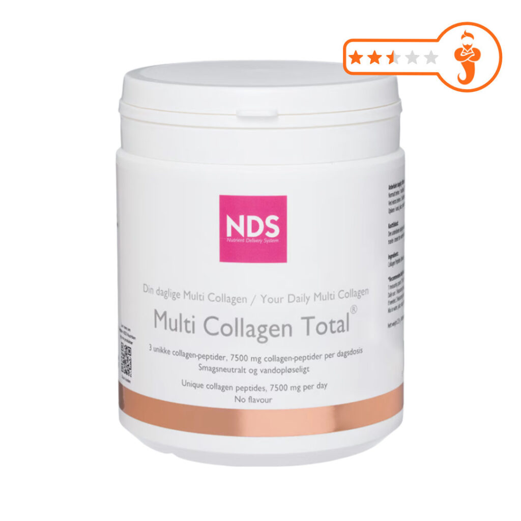 NDS Multicollagen Total indeholder hydrolyseret bovinekollagen (7,5 g pr. daglig dosis) , som reducerer rynker og fine linjer. Produktet er uden ekstra ingredienser, og er neutralt i smagen. Dog trækker det meget ned, at kollagenet ikke er 100% rent!