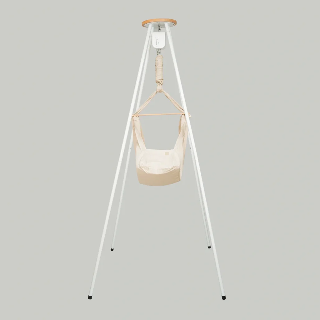 Zleepii Slyngevugge Bundle kombinerer en slyngevugge med en motoriseret vuggebevægelse for at efterligne fornemmelsen fra mors mave. Sættet inkluderer slyngevugge, fjeder, madras, strømforsyning og stativ.